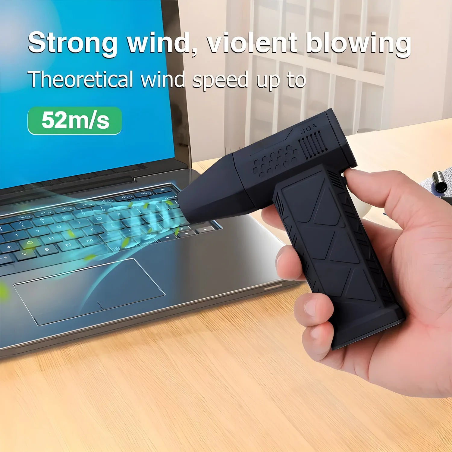 Este miniventilador turbo jet ofrece un potente flujo de aire con un impresionante motor de 130.000 RPM y una velocidad de viento teórica de hasta 52 m/s. Diseñado para una limpieza y refrigeración de alto rendimiento, es ideal para eliminar el polvo de teclados de ordenador, aparatos electrónicos, interiores de coches o para uso en exteriores y en casa. Su diseño compacto y ligero facilita su transporte y manejo, mientras que sus múltiples modos de flujo de aire ofrecen un rendimiento versátil para diversas tareas.