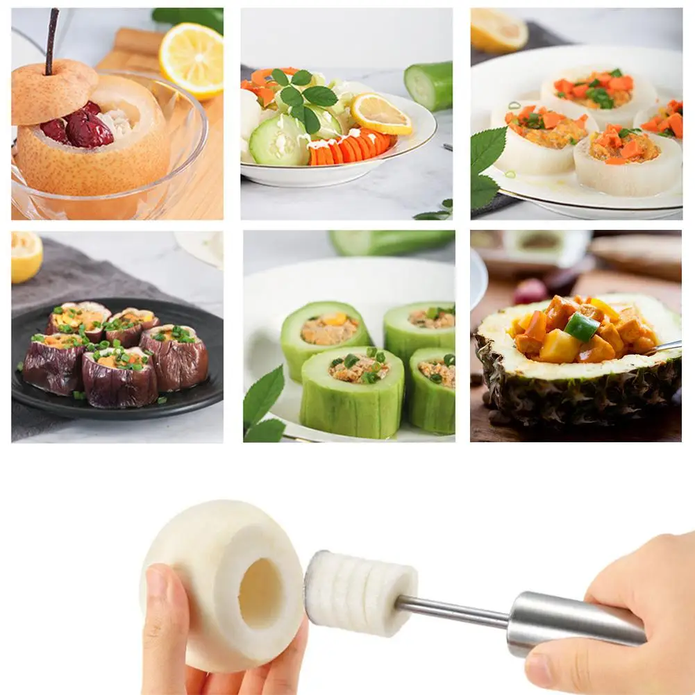 Multipurpose Vegetable Corer: The corer is used for coring and hollowing out vegetables and fruits, including apples, pears, etc. And the corer can be screwed or pushed into the sheller without any effort. Use the end of the handle, you can squeeze lemons or oranges.